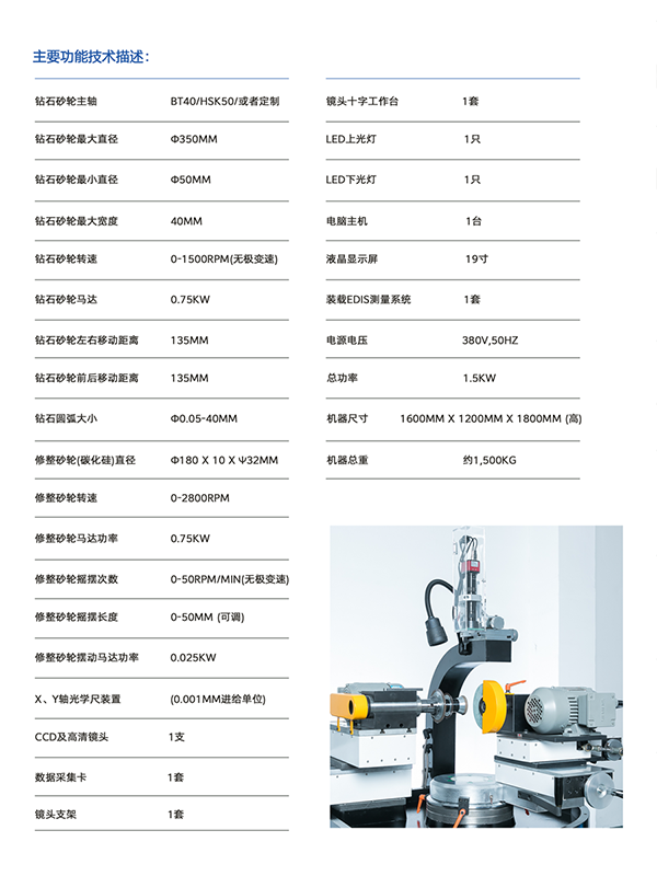 機床主軸砂輪作為被修整的金剛石砂輪或CBN砂輪,附件上所安裝的砂輪作為修整砂輪即綠色碳化硅砂輪;被修整砂輪二個方向可以調(diào)整,即X軸、Y軸;修整砂輪有三個方向可以調(diào)整,即旋轉(zhuǎn)A軸、X1軸和Y1軸,并且可以變頻調(diào)速的往復(fù)擺動,除此之外,X1軸和Y1軸之間可以旋轉(zhuǎn)和定位,可以實現(xiàn)修整砂輪做180°旋轉(zhuǎn);機床配有CCD光學(xué)測量系統(tǒng)、光柵尺數(shù)顯測量系統(tǒng)、10到100倍之放大系統(tǒng)、液晶顯示器。