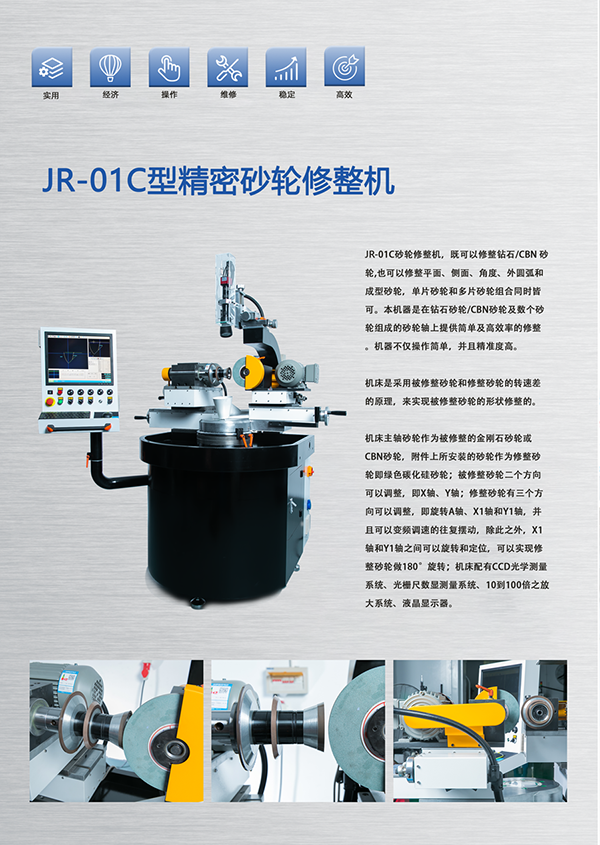 JR-01C砂輪修整機,既可以修整鉆石/CBN 砂輪,也可以修整平面、側(cè)面、角度、外圓弧和成型砂輪,單片砂輪和多片砂輪組合同時皆可。本機器是在鉆石砂輪/CBN砂輪及數(shù)個砂輪組成的砂輪軸上提供簡單及高效率的修整。機器不僅操作簡單,并且精準(zhǔn)度高。
